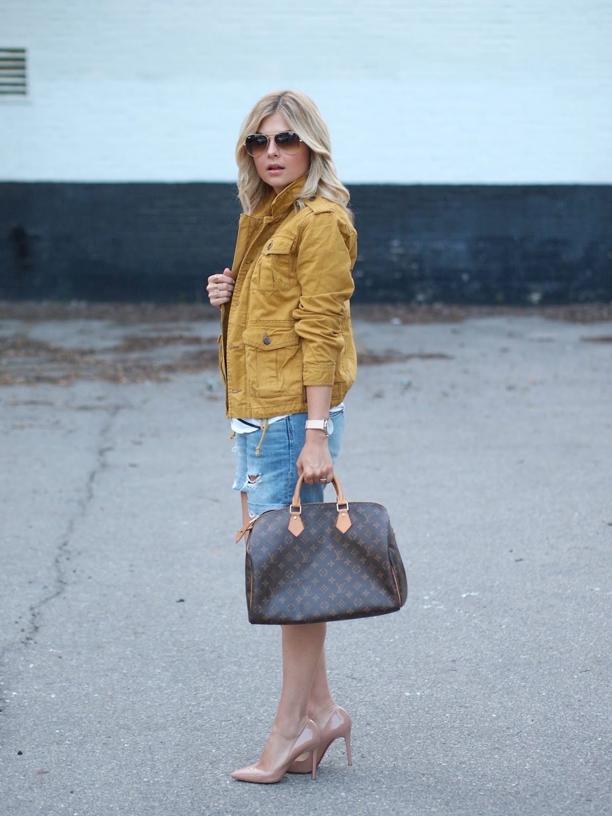 | Jacket: c/o Joe Fresh | Tee: Aritzia {similar} | Shorts: Gap {similar} | Shoes: Christian Louboutin {similar} | Bag: Louis Vuitton | Sunglasses: Ray Ban | Watch: The Horse | Bracelets: c/o Brandy Pham, Hermes | Necklace: c/o Julie Vos Slightly obsessed with this outfit from the weekend! |
