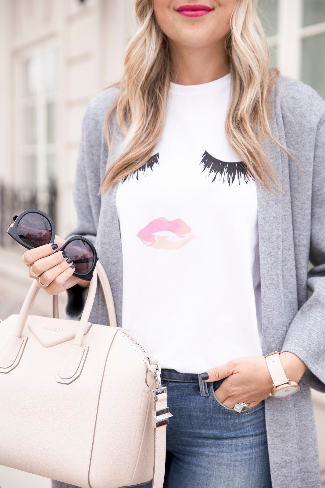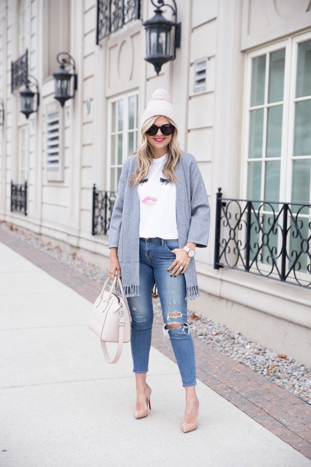 Toque: Old, similar | Sweater: c/o Chicwish | Tee: Sincerely Jules | Jeans: J Brand | Shoes: Christian Louboutin {Designer Dupe} | Bag: Givenchy {Designer Dupe} | Sunglasses: Karen Walker | Watch: MK | Cuff: c/o Brandy Pham